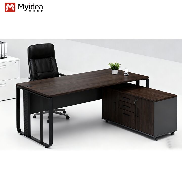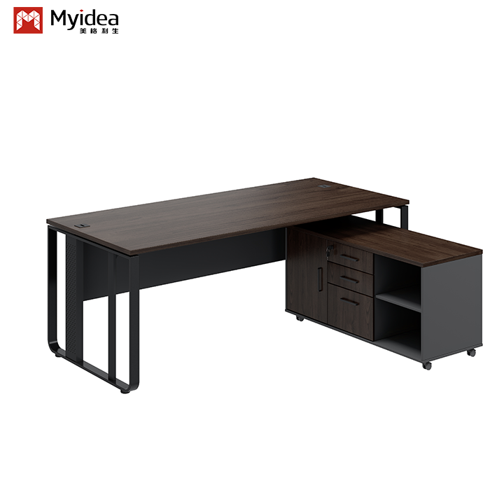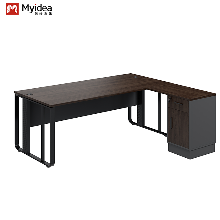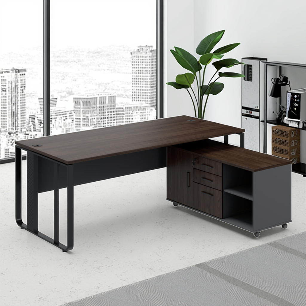 Bàn điều hành của một ông chủ sang trọng hiện đại với thiết kế chân thép và phòng lưu trữ phụ cho tòa nhà văn phòng